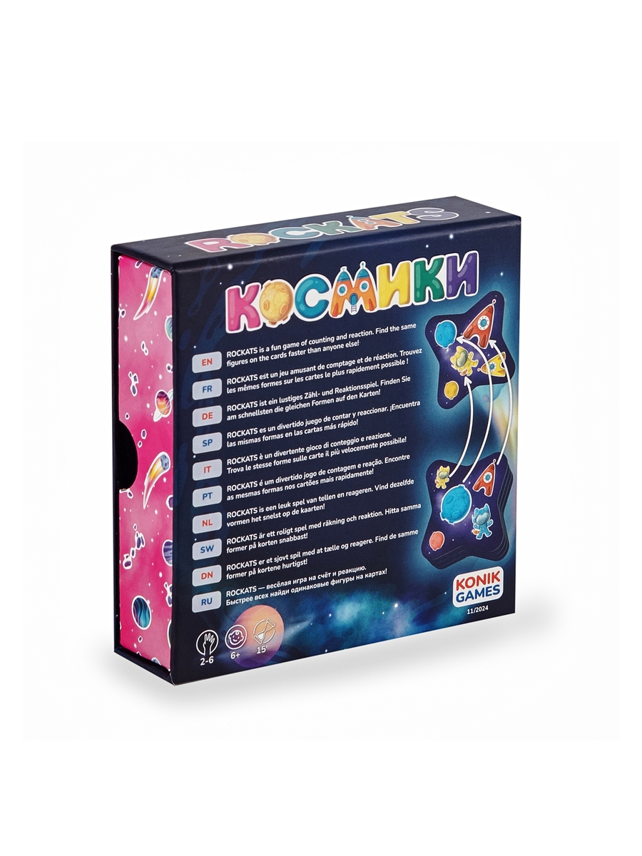 КОСМИКИ – веселая игра на счет и реакцию. Проверь свою наблюдательность – быстрее всех сосчитай одинаковые фигуры на картах и объяви число! На каждой паре карт может совпадать от 1 до 4 картинок. Но будь внимателен – важны только цвет и форма, размер изображений значения не имеет. Итак, поехали!
