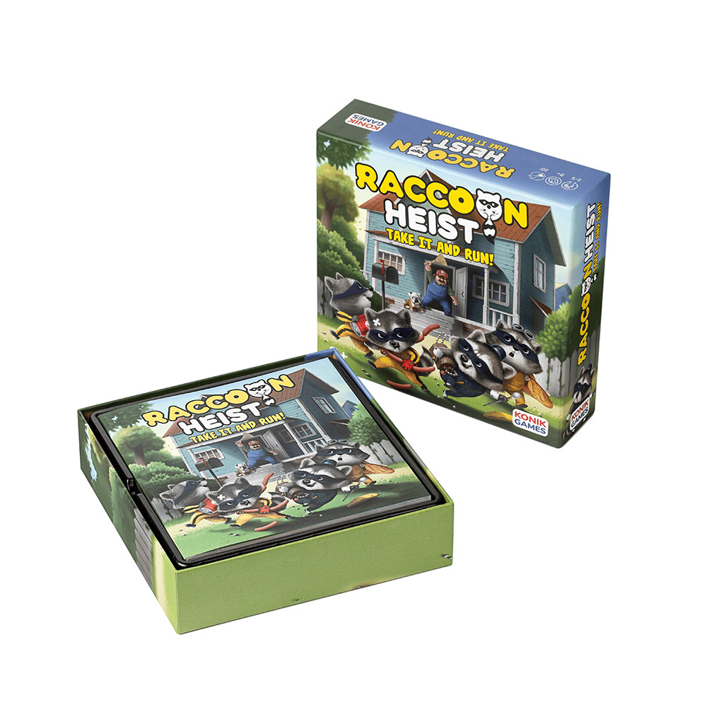 "БАНДА ЕНОТОВ" / RACCOON HEIST от КОНИК ГЕЙМС – это веселая полукооперативная карточная настольная игра в жанре "один против всех" на блеф и угадывание для детей и взрослых. Один из участников играет за хозяина дома, а остальные - за хитрых енотов-воришек, совершающих налеты на дом. Задача хозяина — устроить засаду в одной из 5 локаций, переловить всех енотов у одного игрока и отправить их на задний двор. Енотам нужно угадать намерения хозяина, избежать ловушек и стащить жетоны еды. Это семейная игра для 2-5 человек от 8 лет и старше. Минимальное число участников - 2, максимальное - 5. Время партии от 20 до 40 минут.