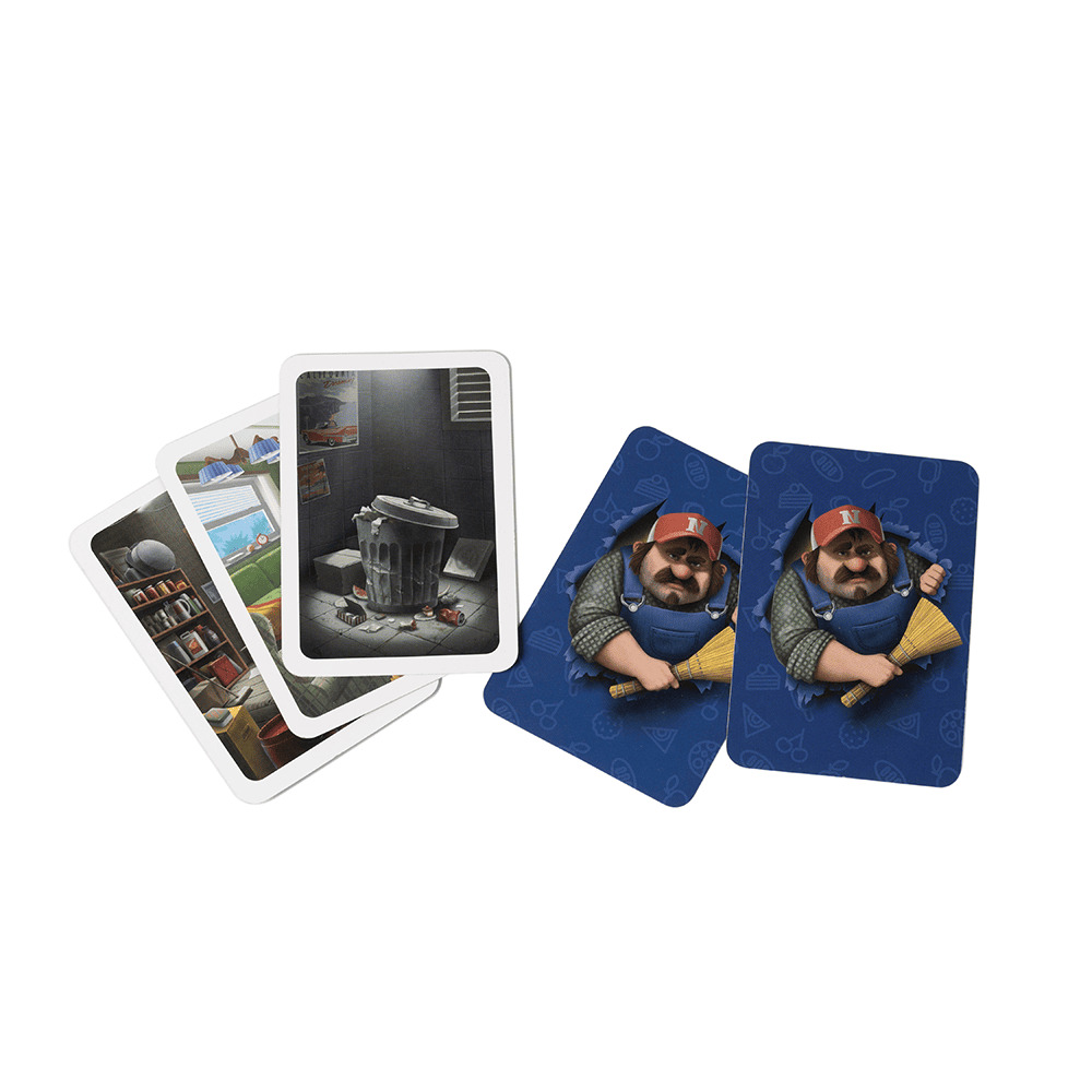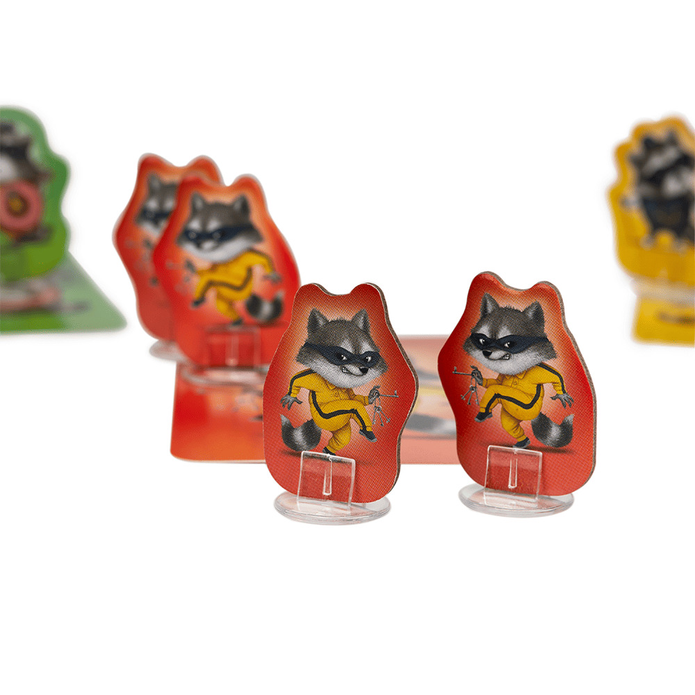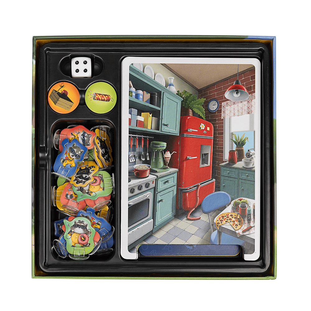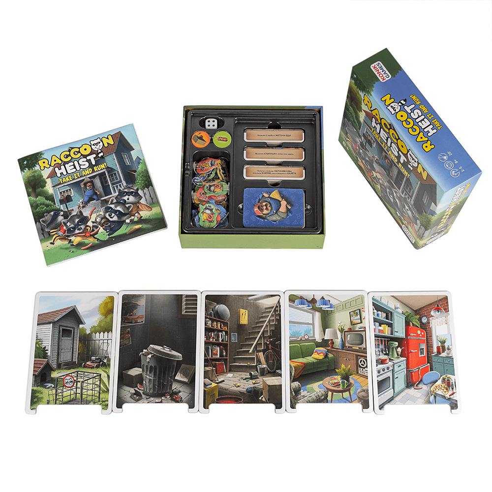 Комплектация: 5 больших и 5 маленьких карт локаций, 28 вырубных картонных фигурок енотов на подставках, 4 карты налёта, 29 жетонов еды, 1 жетон ловушки, 1 жетон хлопушки, 1 фигурка собаки, 1 кубик, 25 табличек с памятками на 5 языках (русский, белорусский, армянский, казахский, азербайджанский), правила игры, ложемент. Все это упаковано в красивую коробку, которая станет отличным подарком для любителей необычных настолок.