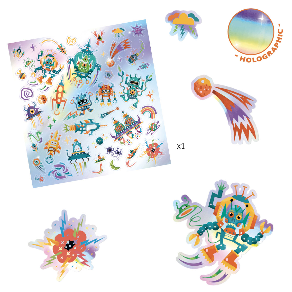 Отправляйтесь в замечательное путешествие в открытый космос вместе с ярким набором наклеек «Другая галактика» от французского бренда Djeco.