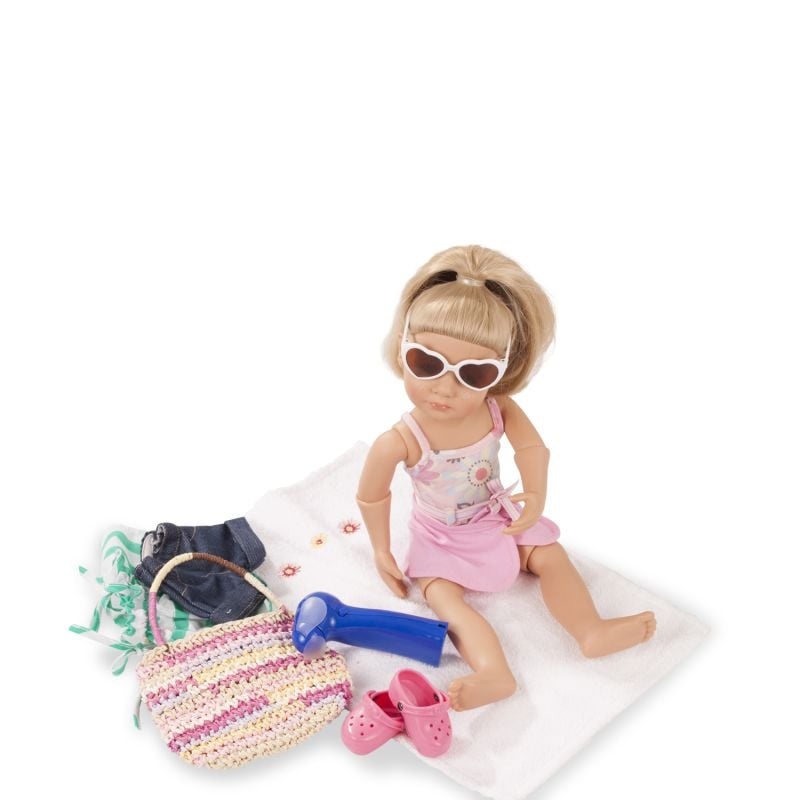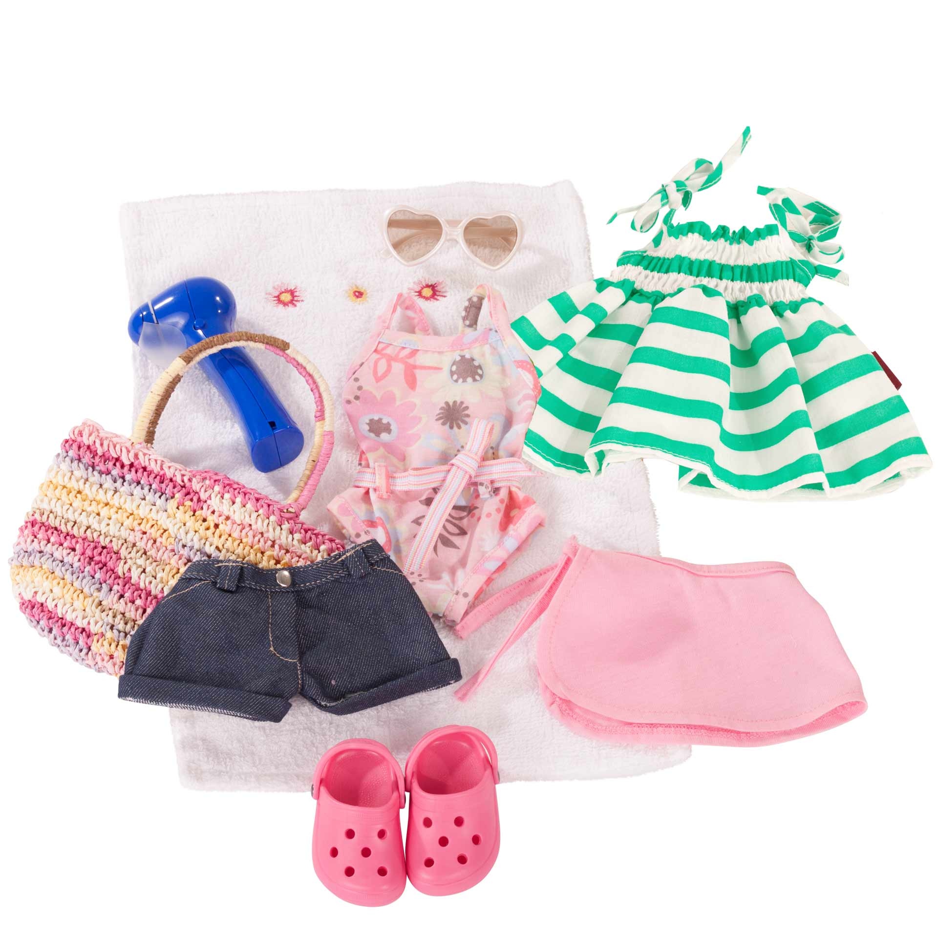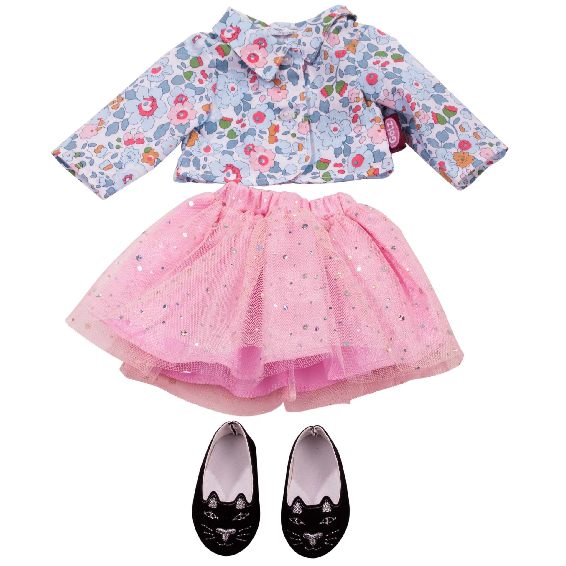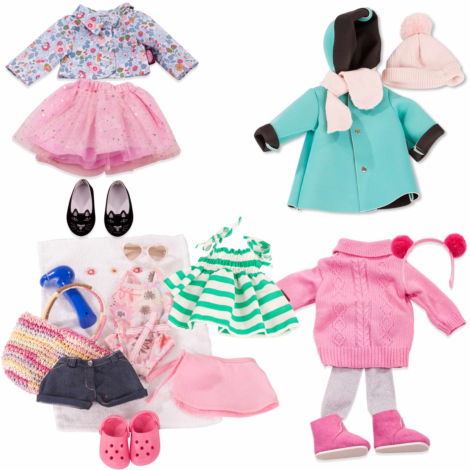 Набор одежды и аксессуаров немецкого бренда GOTZ создан специально для кукол 36 см. Этот большой набор поможет создать стильный образ для куклы на разные случаи жизни и на любой сезон. В комплект входят жакет небесно-голубого цвета с цветочным принтом, пышная розовая юбка с сеткой и блестящими пайетками, черные балетки с кошачьими мордочками, солнечные очки-сердечки, полосатый сарафан с полосками мятного цвета, джинсовые шорты, купальник с поясом, парео на завязках, резиновые тапочки, вентилятор для лица и большая сумка с полотенцем, вязаная туника и теплые колготки с блёстками, ободок для волос с пушистыми ушками и розовые мягкие угги, пальто с капюшоном бирюзового цвета, нежно-розовые шапка и шарф.