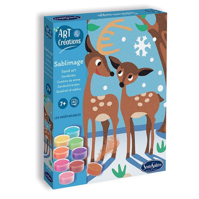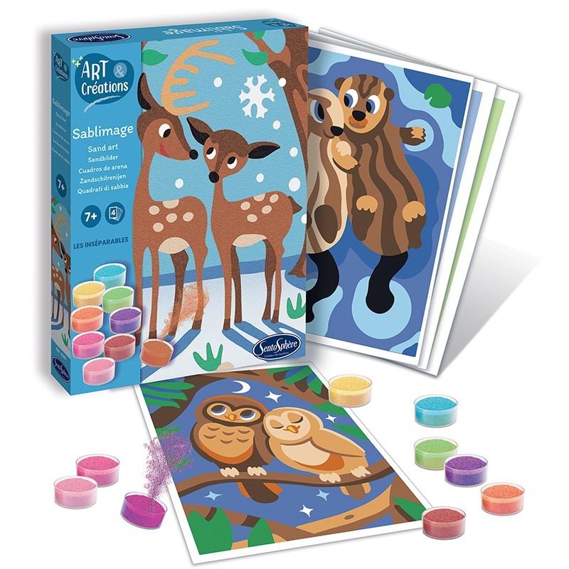 Песочные картинки «Неразлучные друзья» — это творческий набор для детей, с помощью которого вы создадите 4 замечательных картины из декоративного цветного песка своими руками.